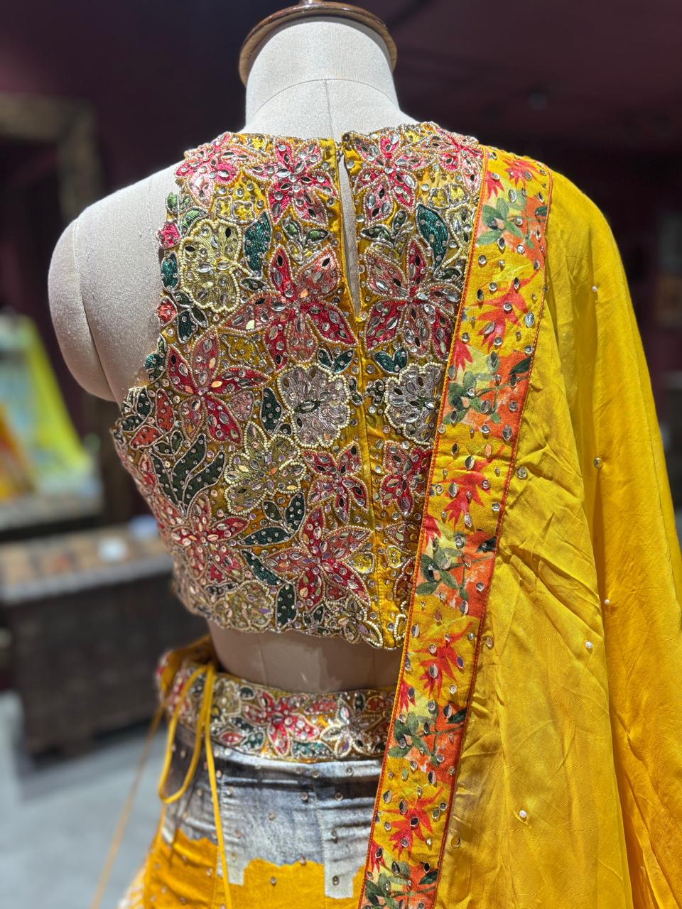 This lively multicolour lehenga is designed for brides and bridesmaids who love bold, artistic fashion. The skirt features a striking yellow base enhanced with vibrant orange, green and red printed motifs inspired by nature and festive elements. The intricately embroidered blouse adds richness with detailed thread and embellishment work around the neckline and waist. Paired with a coordinated dupatta in a bright matching tone, this lehenga is perfect for haldi, mehendi and pre-wedding functions. It beautifully blends playful colours with traditional craftsmanship for a joyful celebration look.