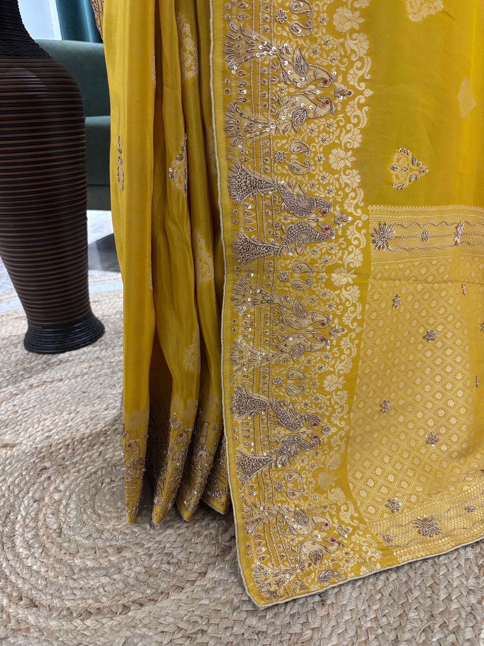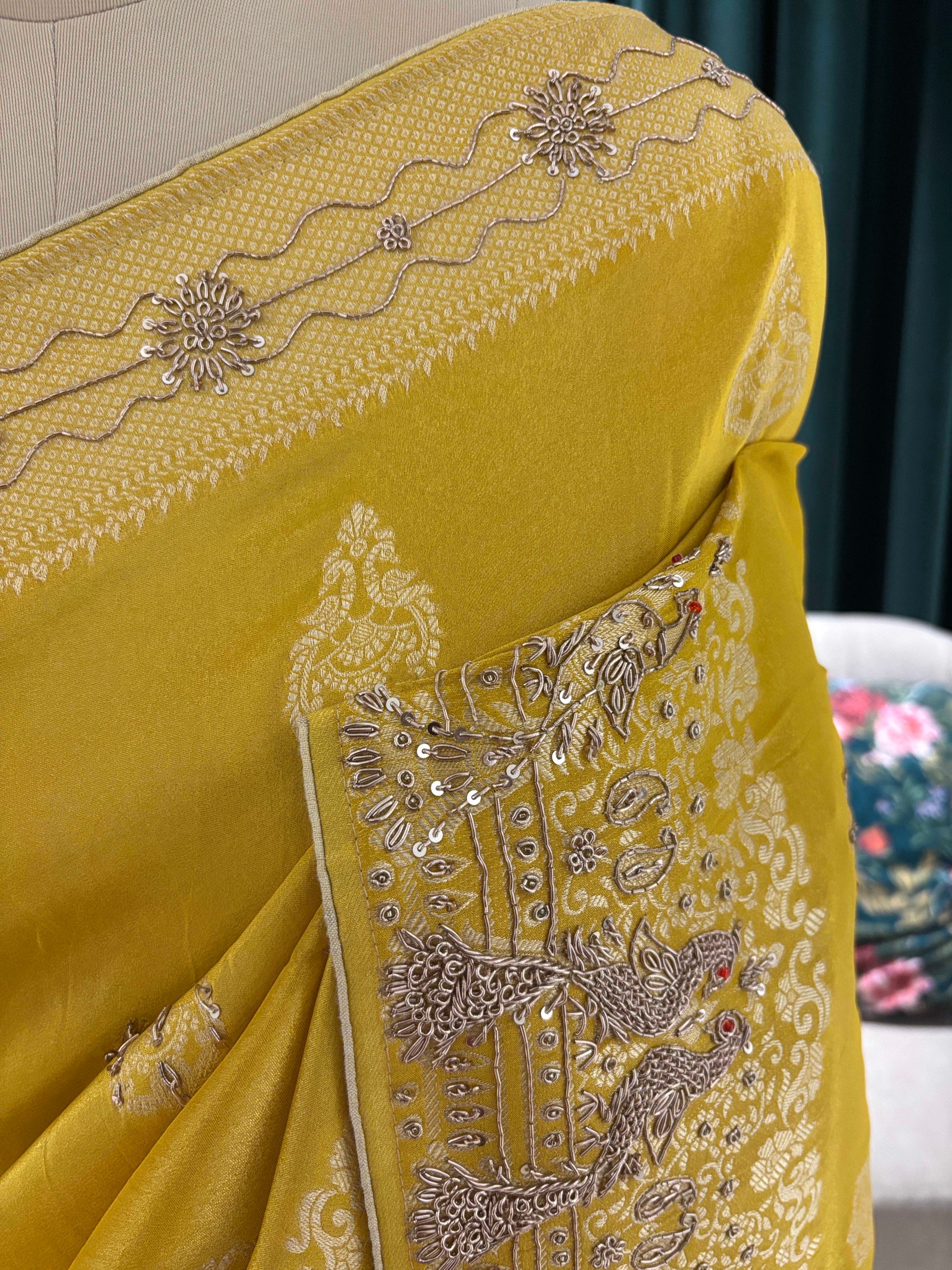 Enhance your ethnic wardrobe with this elegant mustard yellow saree, designed to offer a perfect blend of tradition and sophistication. The saree features delicate silver zari embroidery spread gracefully across the body, creating a subtle shimmer that adds to its refined appeal.