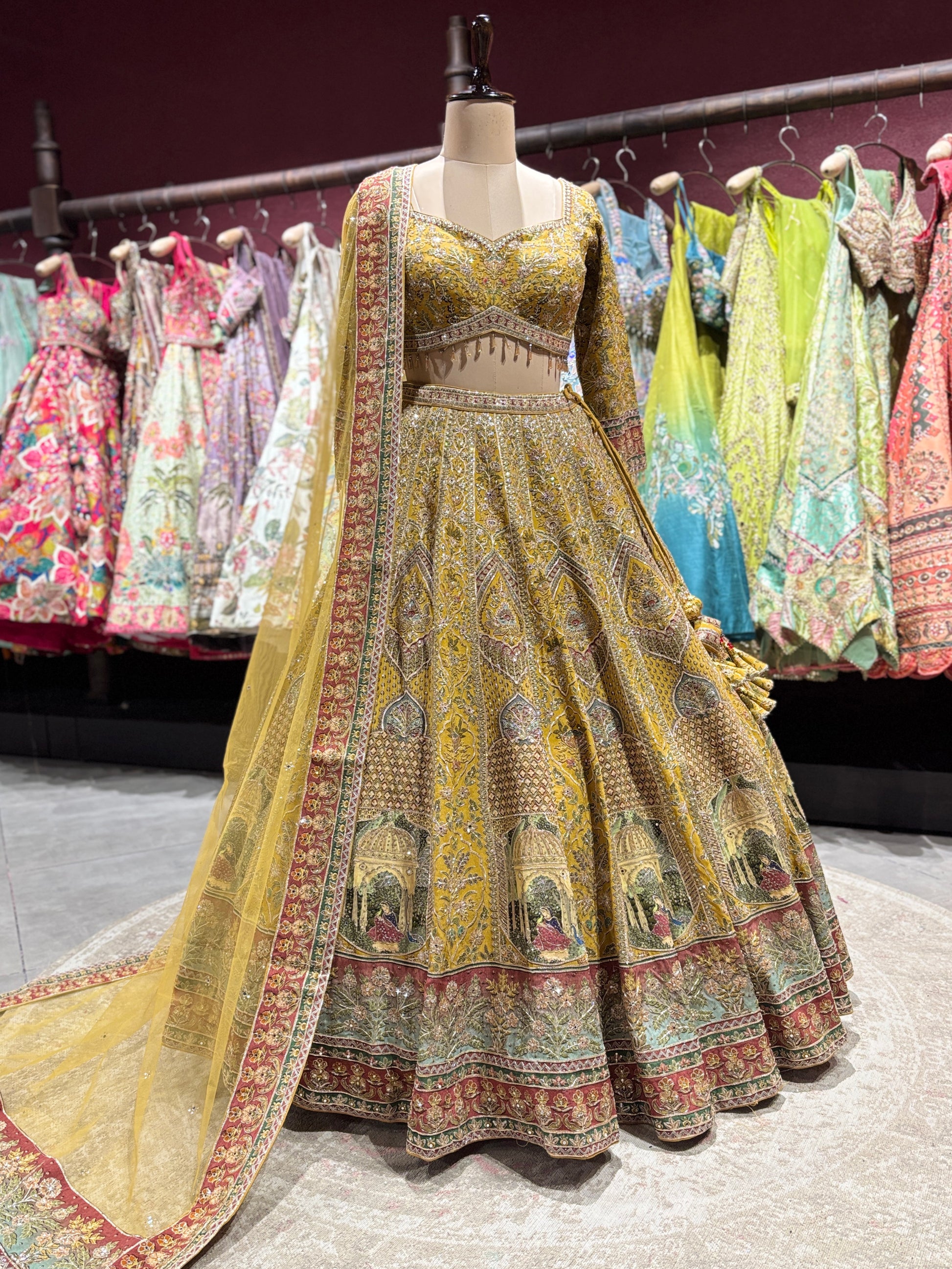Bring timeless elegance to your festive wardrobe with this stunning mustard yellow silk lehenga set, crafted with rich detailing and traditional artistry. The lehenga features intricate zari embroidery combined with finely detailed scenic and architectural motifs along the border, creating a regal and heritage-inspired appeal. Its graceful flare adds volume and movement, making it perfect for grand occasions.