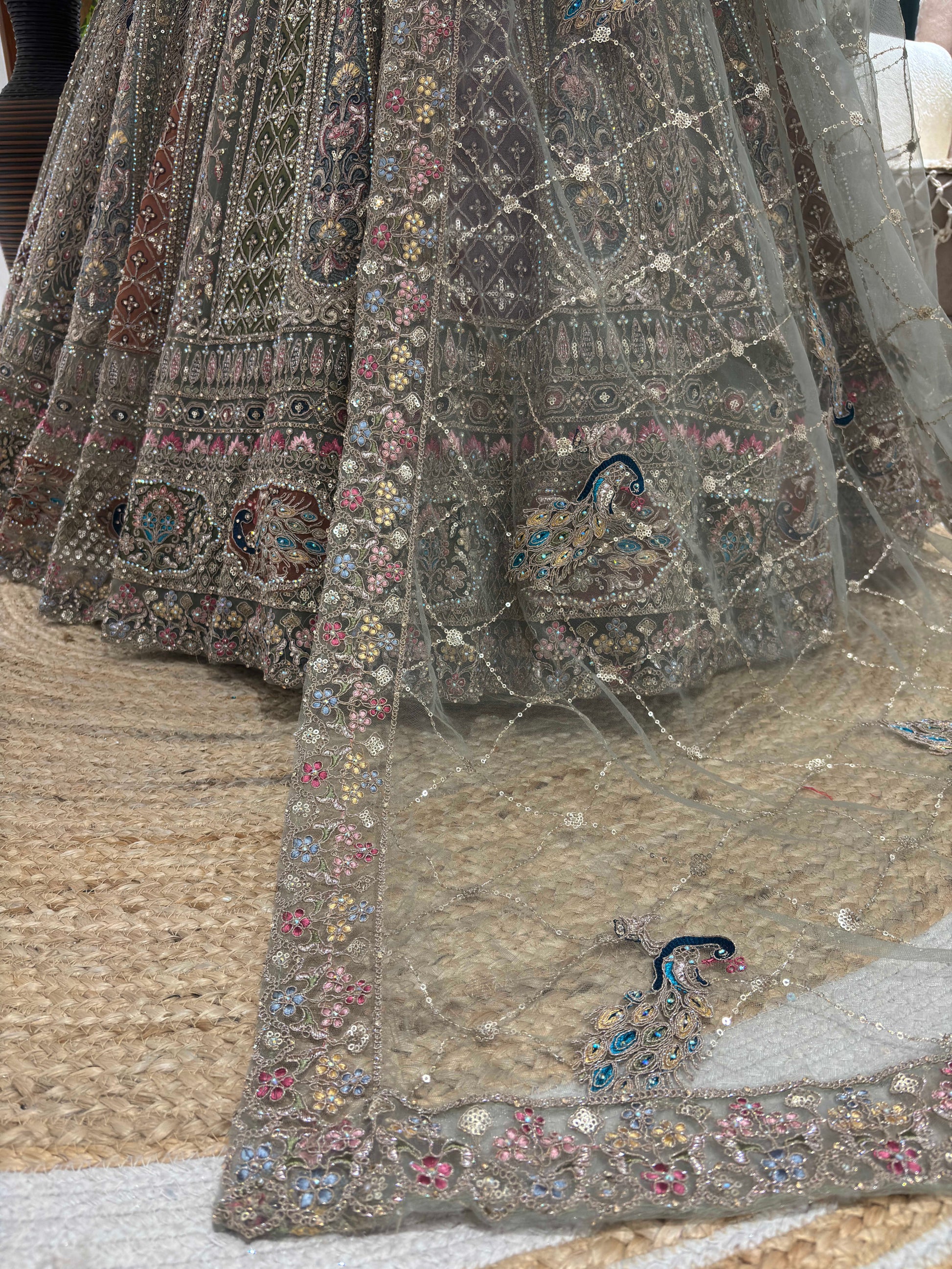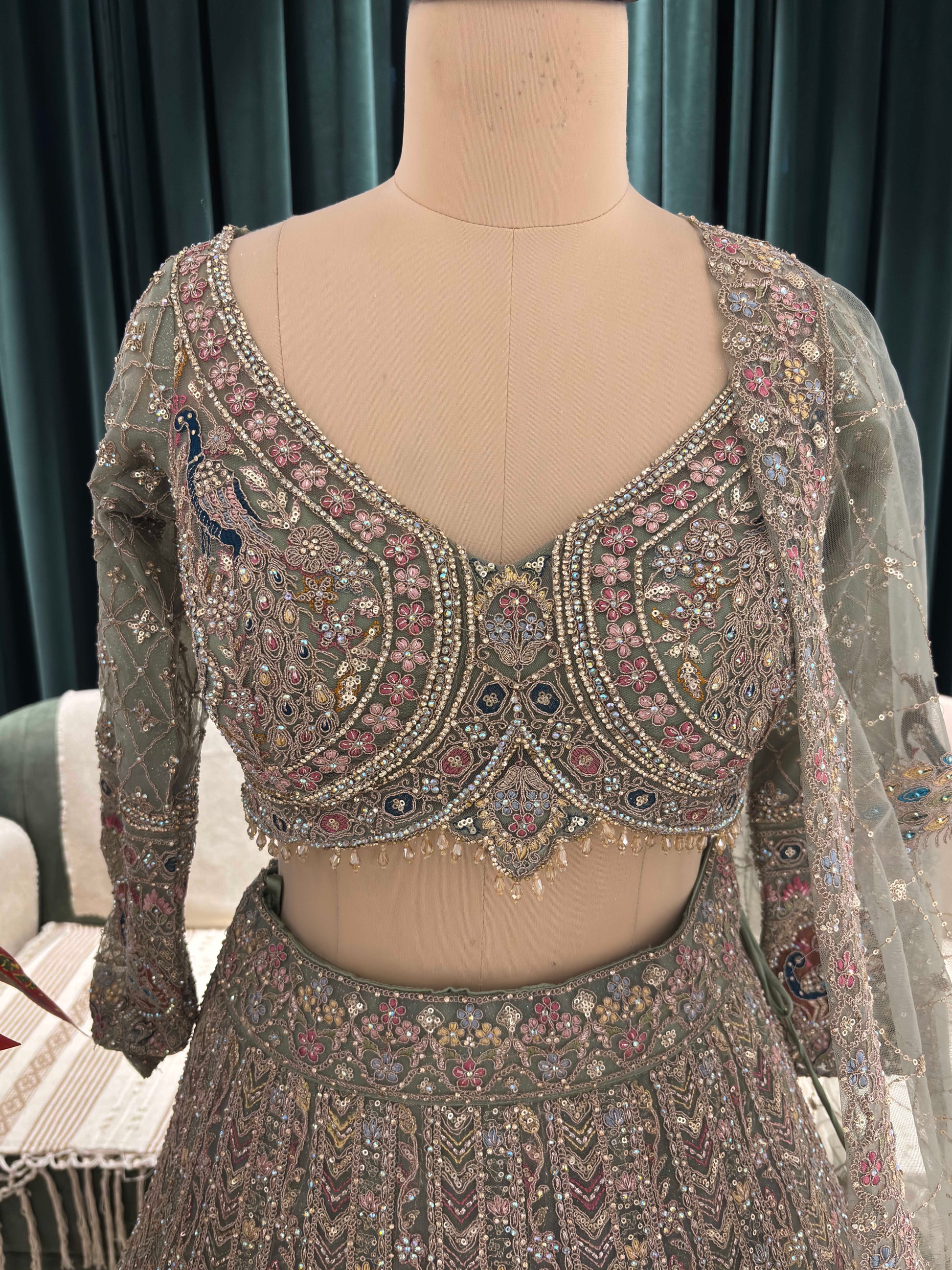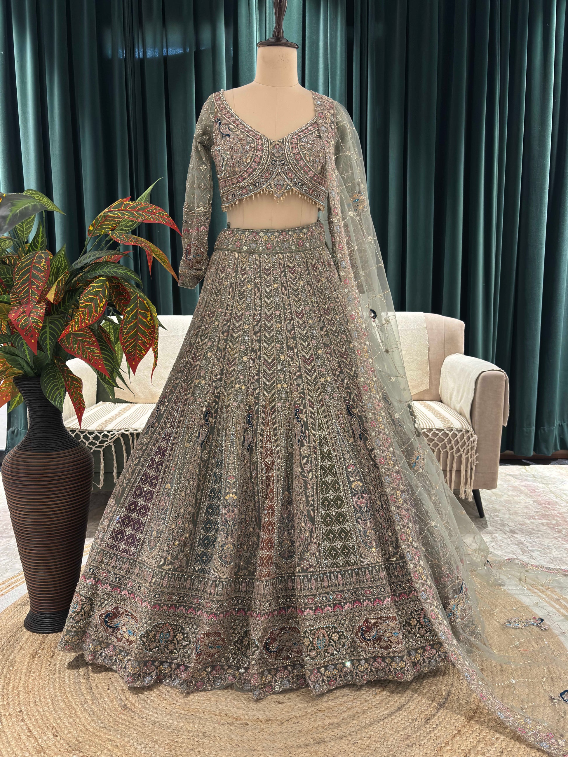 Elevate your sangeet style with this ethereal Net Green Designer Sangeet Lehenga, a celebration of heritage artistry and modern glamour. Crafted for the spotlight, this ensemble features: Intricate Zari and Multi-Thread Embroidery: Traditional motifs shimmer across the flared skirt and blouse, adding depth and richness. Sequins & American Diamond Accents: Strategically placed embellishments catch the light with every move, perfect for dance-filled sangeet nights. Sheer Dupatta with Delicate Borders: Softly draped to enhance the silhouette while balancing opulence with elegance. Whether you're the bride, bridesmaid, or a guest looking for standout Sangeet Outfit Ideas, this lehenga offers the perfect blend of sophistication and sparkle. Ideal for those seeking a Lehenga for Sangeet that’s both timeless and trend-forward.