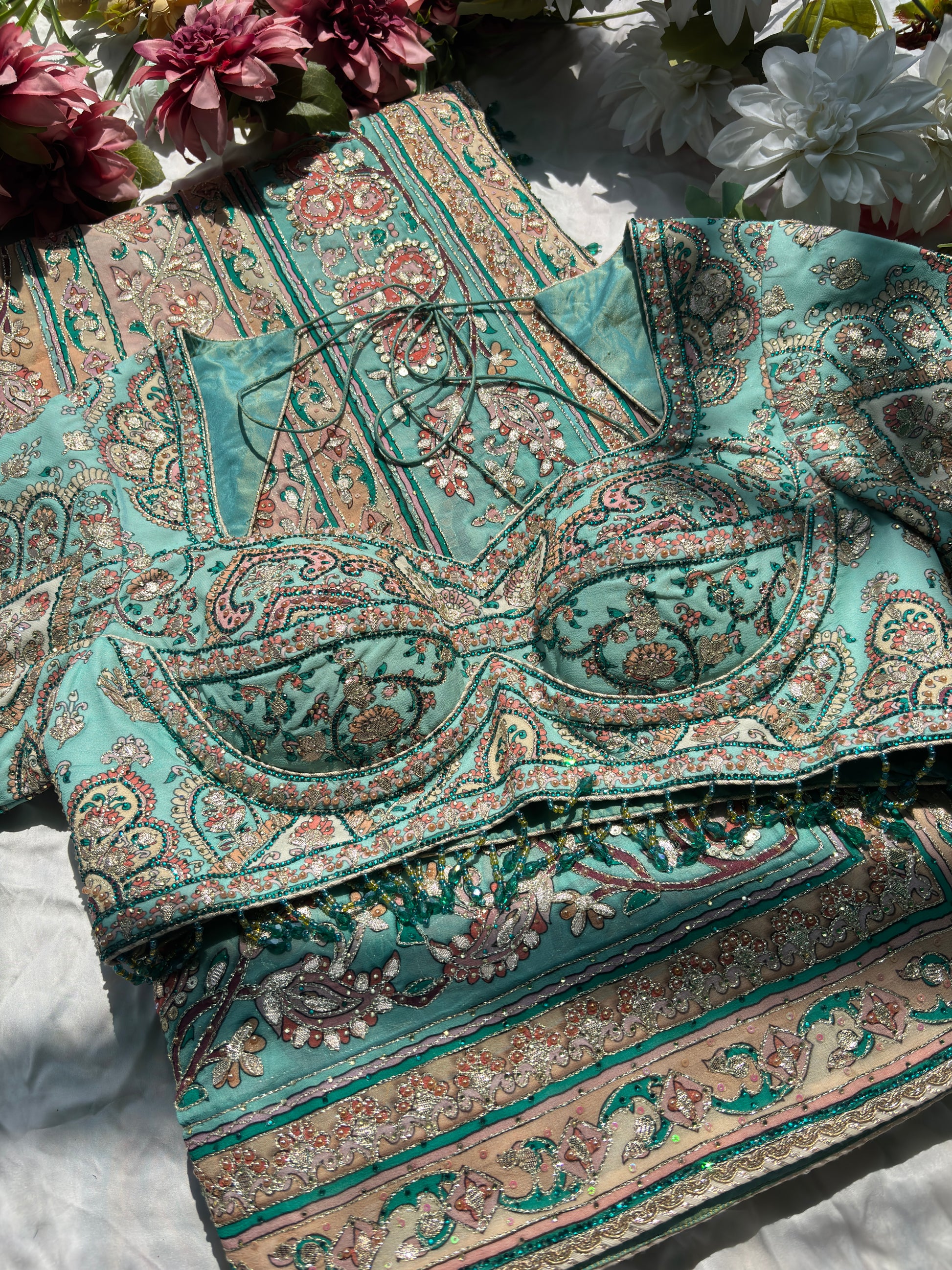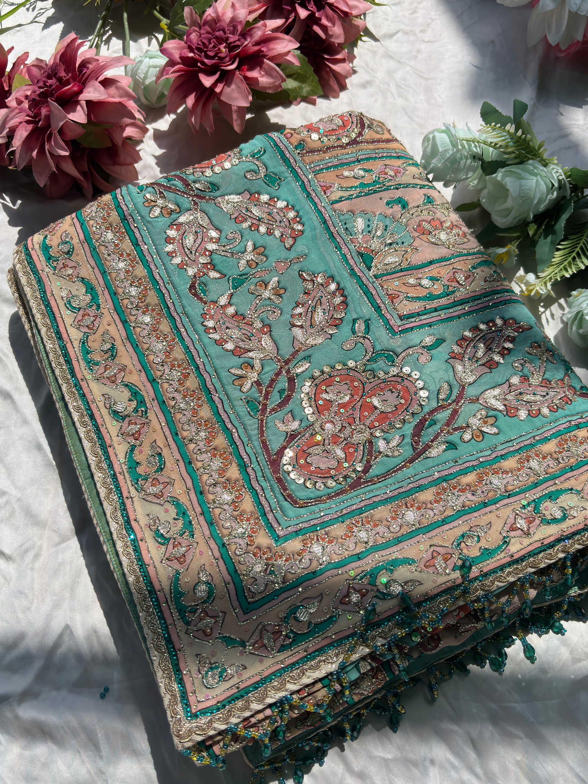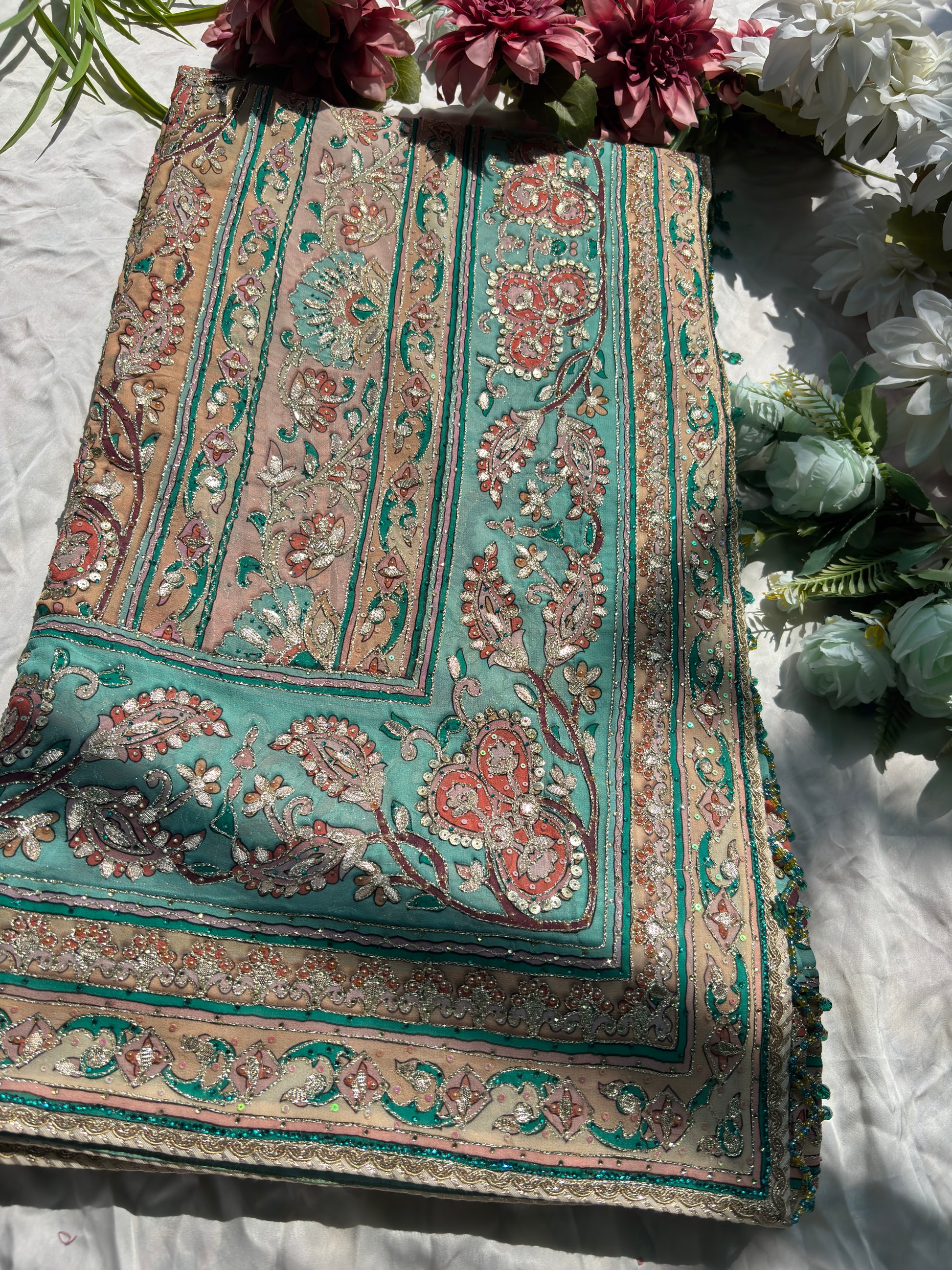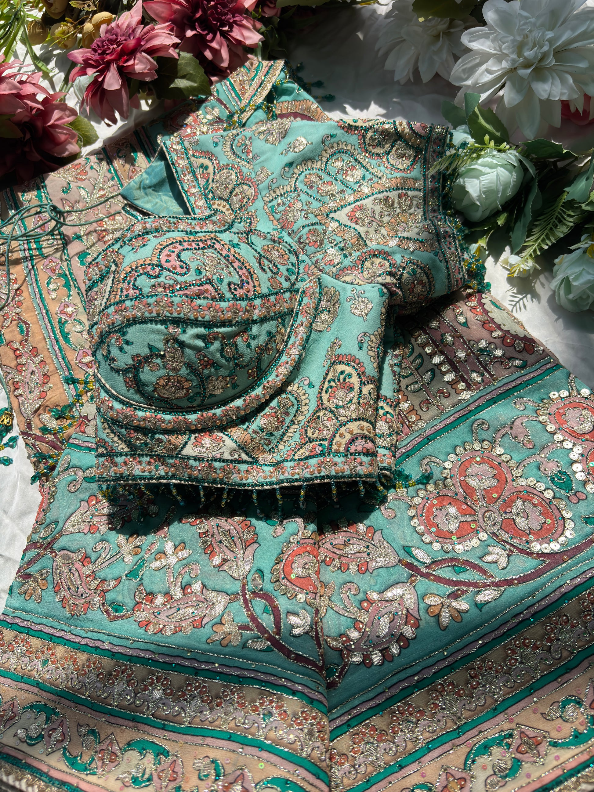 Embrace elegance with this beautiful pastel designer saree featuring intricate paisley prints in soft shades of turquoise, peach, and beige. The saree is enhanced with delicate sequin and thread detailing that adds a subtle shimmer and graceful charm. Paired with a matching designer blouse adorned with fine embroidery and embellishments, this ensemble reflects a perfect blend of sophistication and style. Ideal for weddings, festive occasions, parties, and daytime celebrations, this saree offers a refreshing and elegant ethnic look.