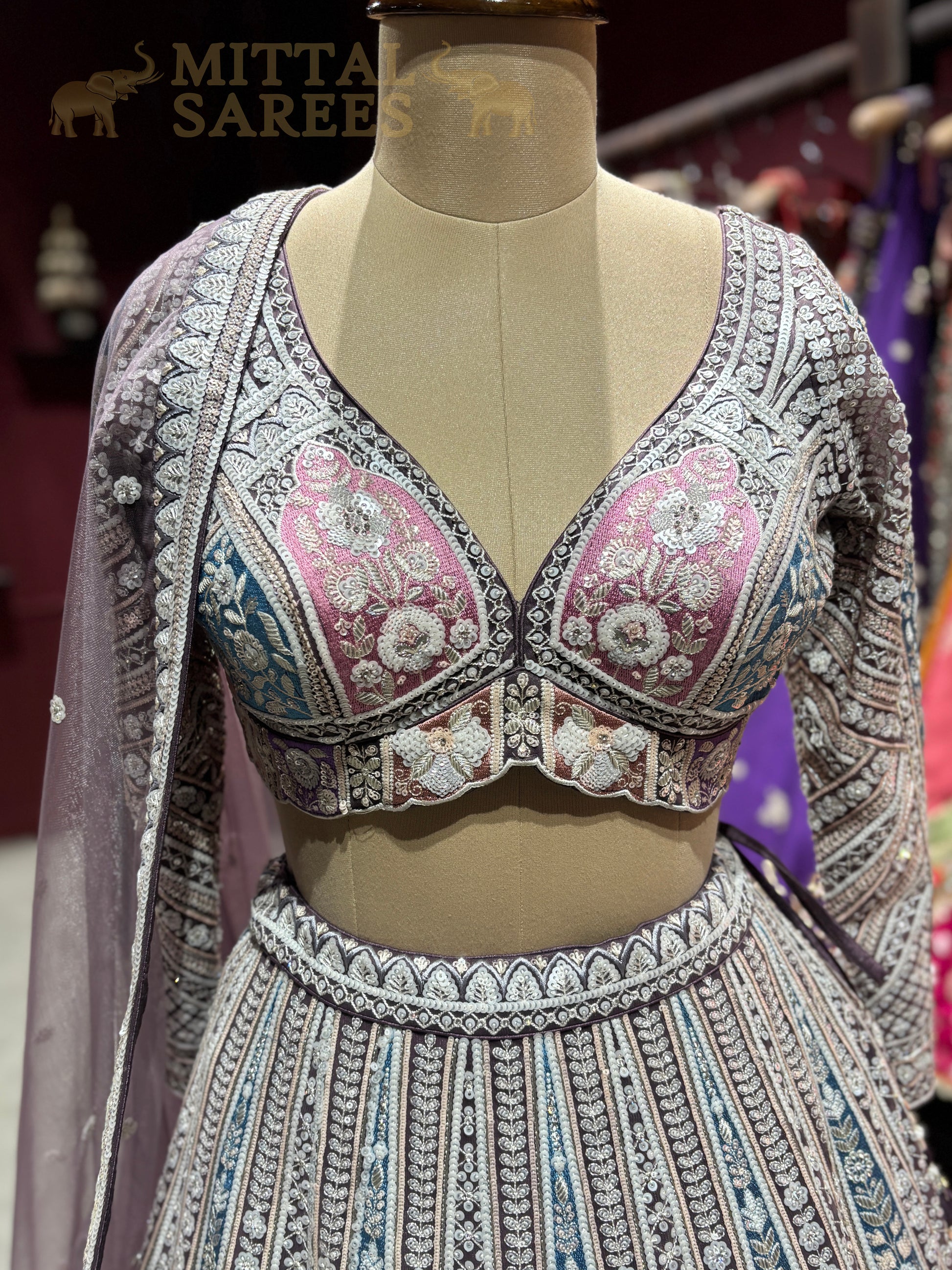 This beautiful pastel bridal lehenga is designed for brides who love subtle colours with royal detailing. The skirt features finely crafted vertical panels adorned with intricate zari and thread embroidery in soft shades of pink, blue and silver. The delicately embroidered blouse enhances the elegance with its graceful neckline and detailed craftsmanship. Paired with a lightweight net dupatta finished with subtle embellishments, this lehenga creates a dreamy and sophisticated bridal look. Perfect for weddings and grand celebrations, it blends tradition with modern pastel charm effortlessly.