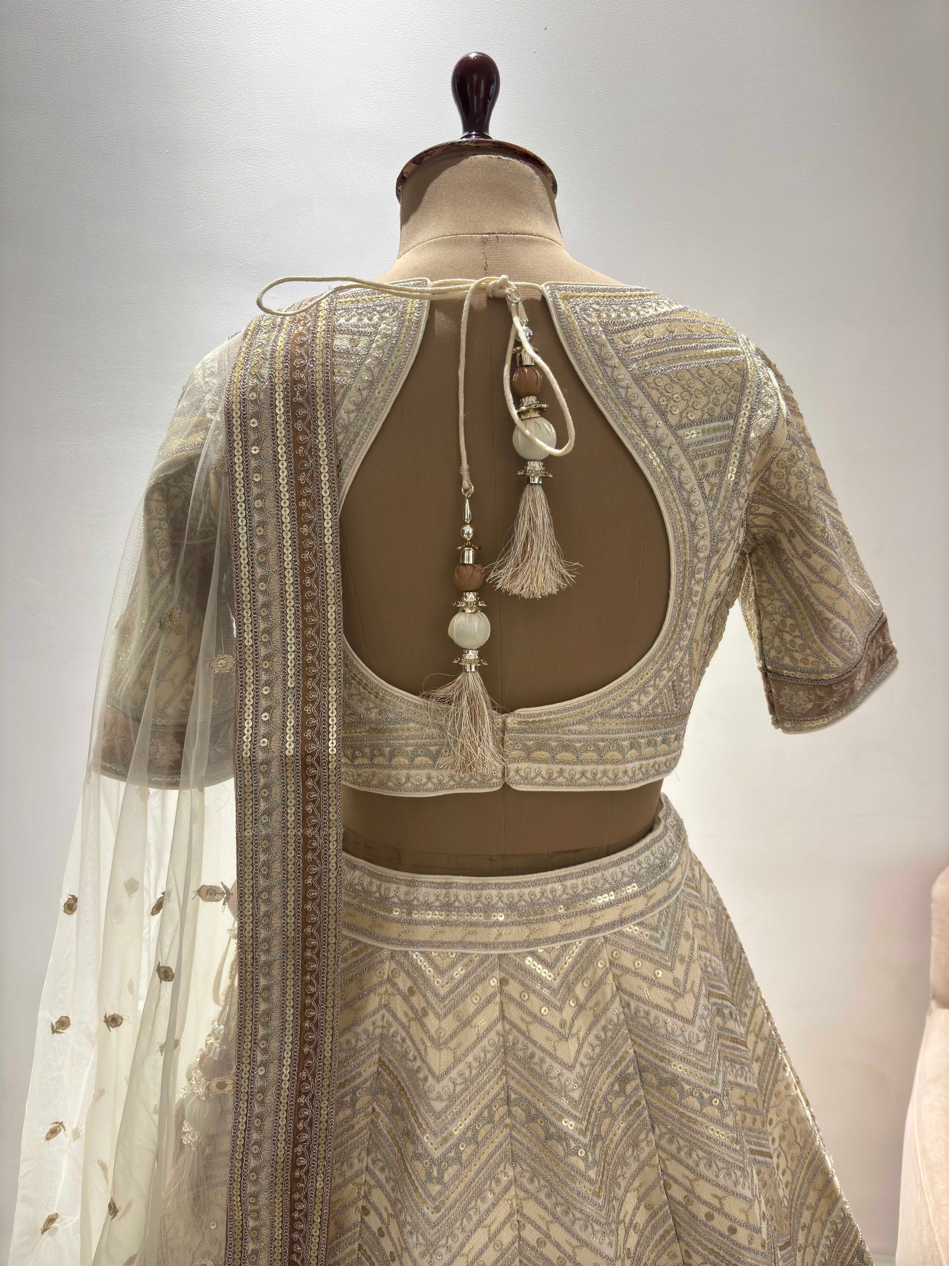 This lehenga showcases a harmonious blend of traditional and modern aesthetics. The blouse, with its intricate detailing, pairs elegantly with the flowing skirt, adorned with geometric and floral embroidery. The ensemble is completed with a sheer dupatta, draped gracefully to enhance the overall appeal. Perfect for weddings, festive celebrations, and other grand occasions, this lehenga is designed to leave a lasting impression