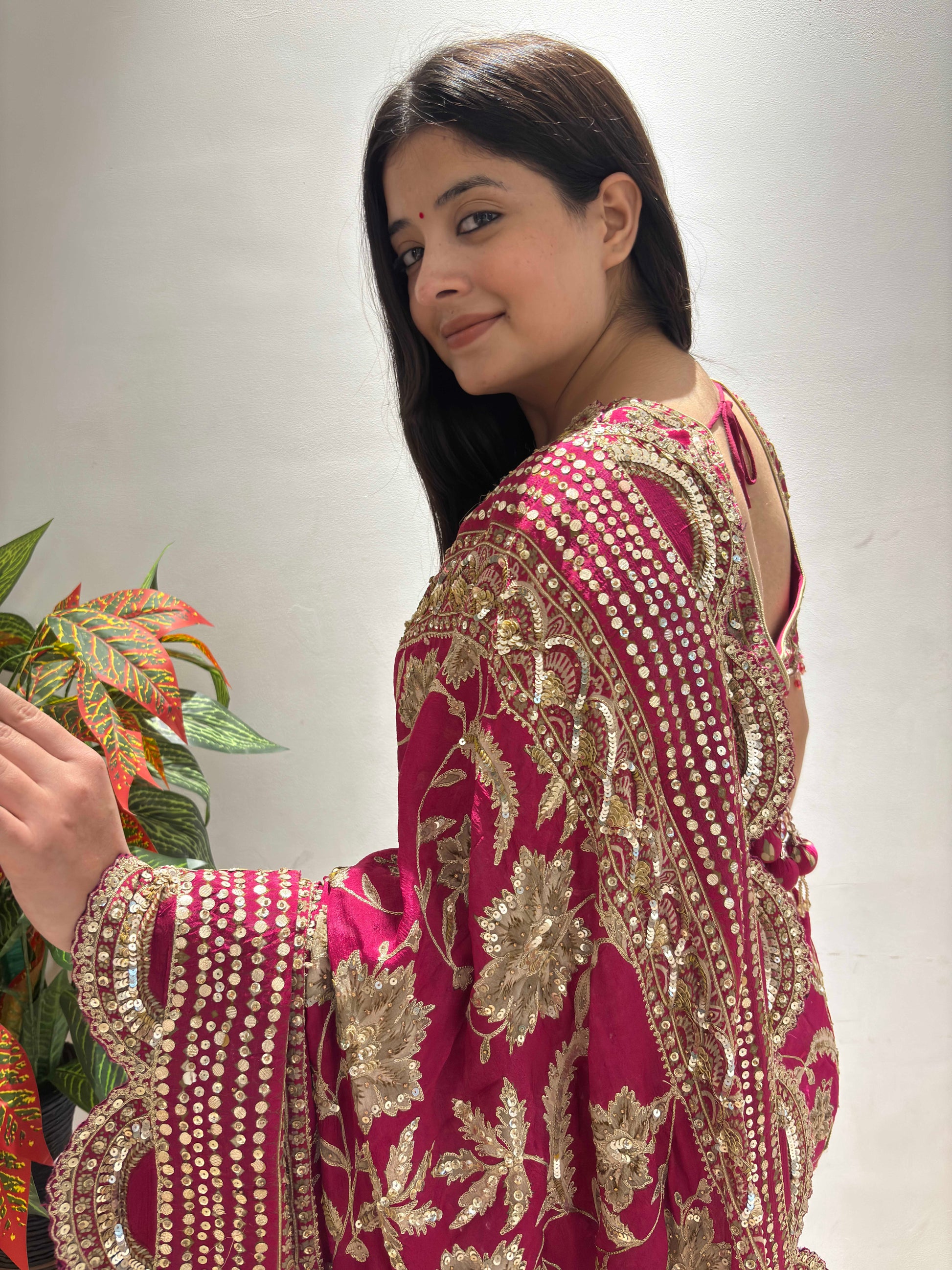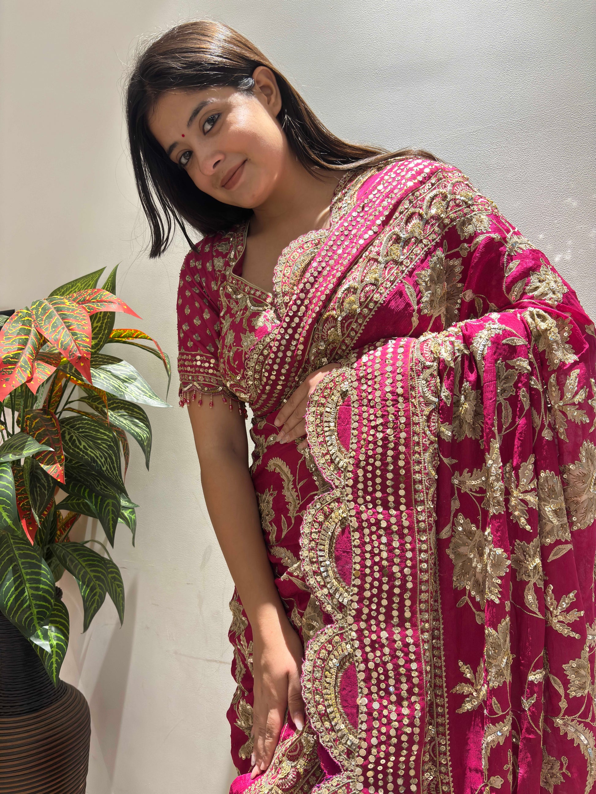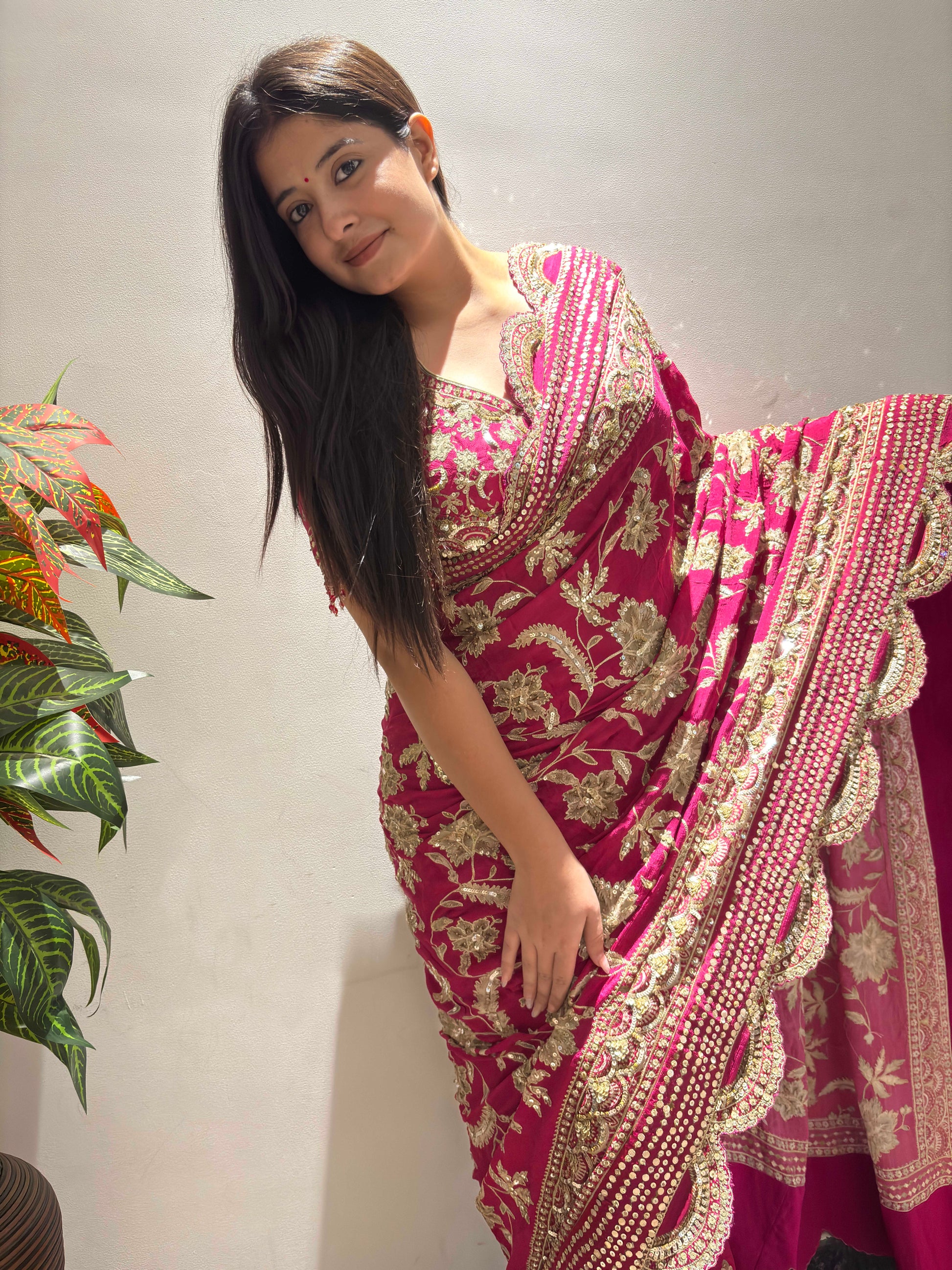This stunning rani pink saree is a celebration of timeless Indian elegance and intricate craftsmanship. Crafted in rich silk fabric, the saree features heavy zari, sequin, and thread embroidery arranged in graceful floral motifs, enhanced with a beautifully detailed scalloped border. The vibrant pink hue paired with golden embellishments creates a regal and festive appeal.