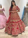 This bridal lehenga exudes regal charm with its intricate golden embroidery, meticulously woven to create a breathtaking display of artistry. The rich texture and refined detailing enhance its majestic appeal, ensuring a sophisticated silhouette that captures timeless grace. Designed for the discerning bride, this ensemble combines heritage craftsmanship with modern refinement, making it a perfect choice for a grand celebration