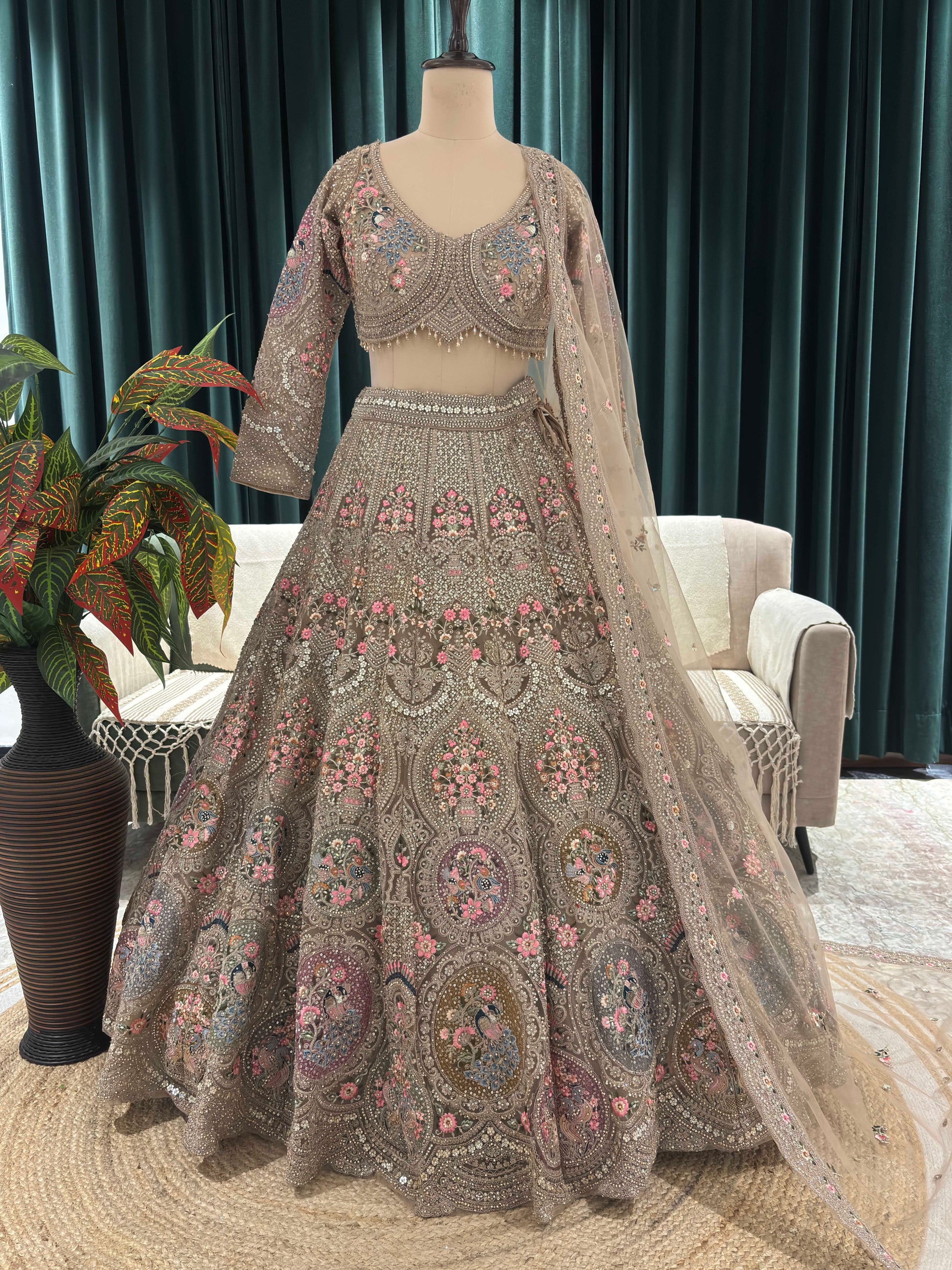 Make an unforgettable entrance in this opulent Reception Lehenga, crafted in shimmering golden net and adorned with exquisite American diamond detailing, radiant sequins, intricate Ari Dori embroidery, and vibrant multi-thread work. The ensemble captures the essence of regal elegance, making it a perfect choice for the modern bride seeking a timeless yet statement-making Bridal lehenga for reception. The voluminous skirt flows with grace, while the delicately embroidered blouse and sheer dupatta elevate the look with refined glamour. Whether you're attending a lavish celebration or curating your dream Lehenga for wedding reception, this piece embodies sophistication and heritage artistry.