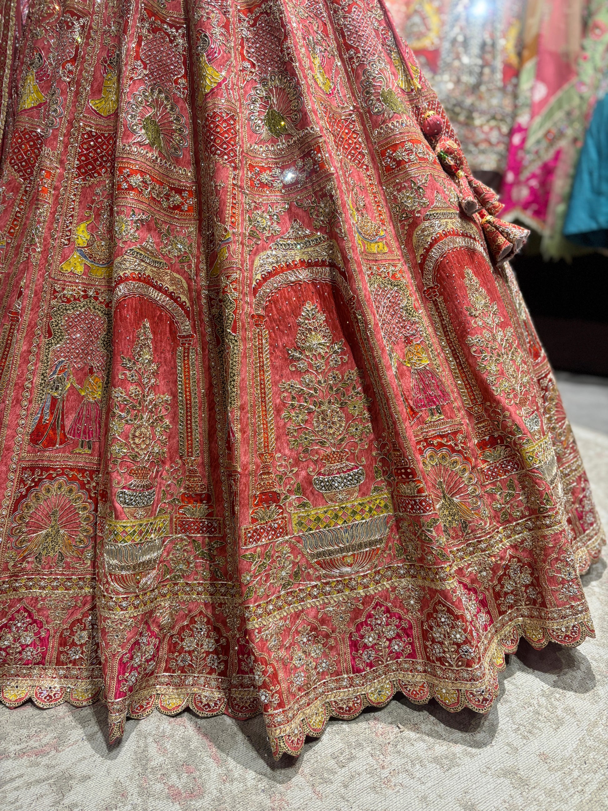Make your special day unforgettable with this breathtaking royal red bridal lehenga, crafted with intricate all-over embroidery and luxurious detailing. Designed using premium fabric, the lehenga features rich threadwork, zari embroidery, and delicate embellishments arranged in traditional motifs inspired by heritage architecture and floral artistry. The grand flare and heavily embroidered border create a majestic silhouette, perfect for weddings and grand celebrations.