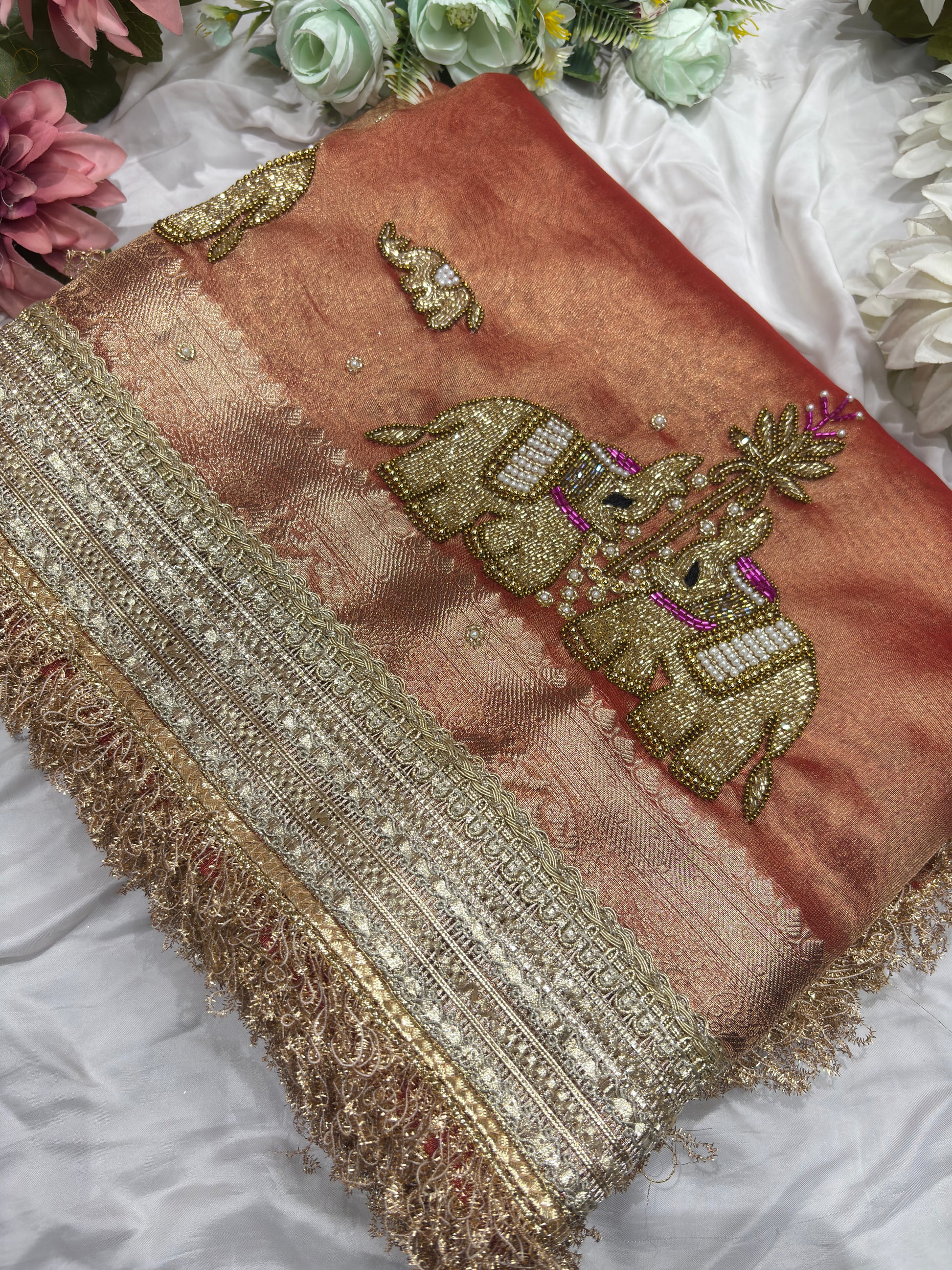 Add a touch of regal elegance to your wardrobe with this stunning saree. Designed with a rich sheen, it features beautifully handcrafted elephant motifs enhanced with intricate bead, stone, and zari work. The saree is further elevated by its heavy woven zari border with fine detailing, giving it a luxurious and traditional appeal. Perfect for weddings, festive occasions, and special celebrations, this saree offers a graceful and premium look.