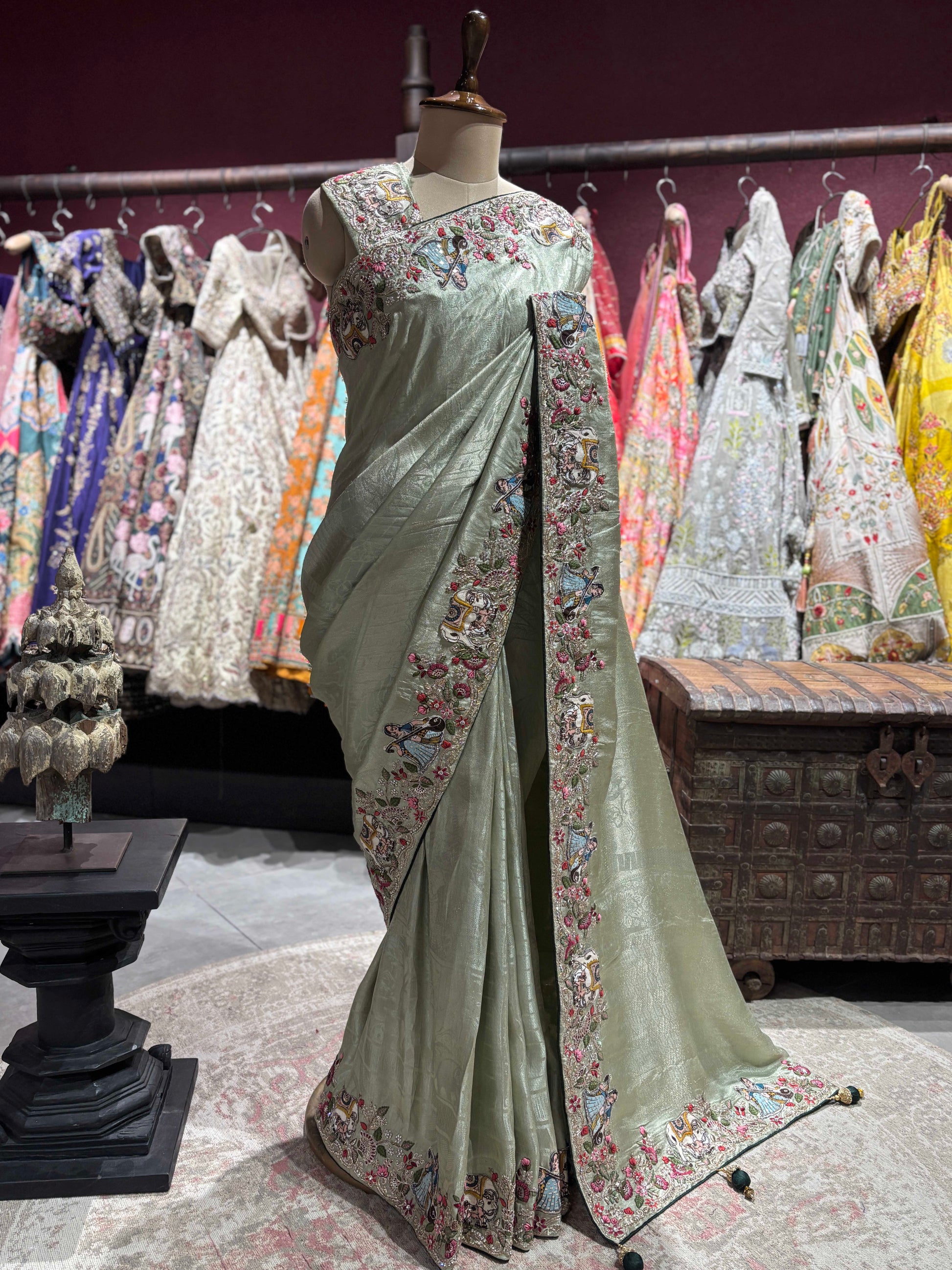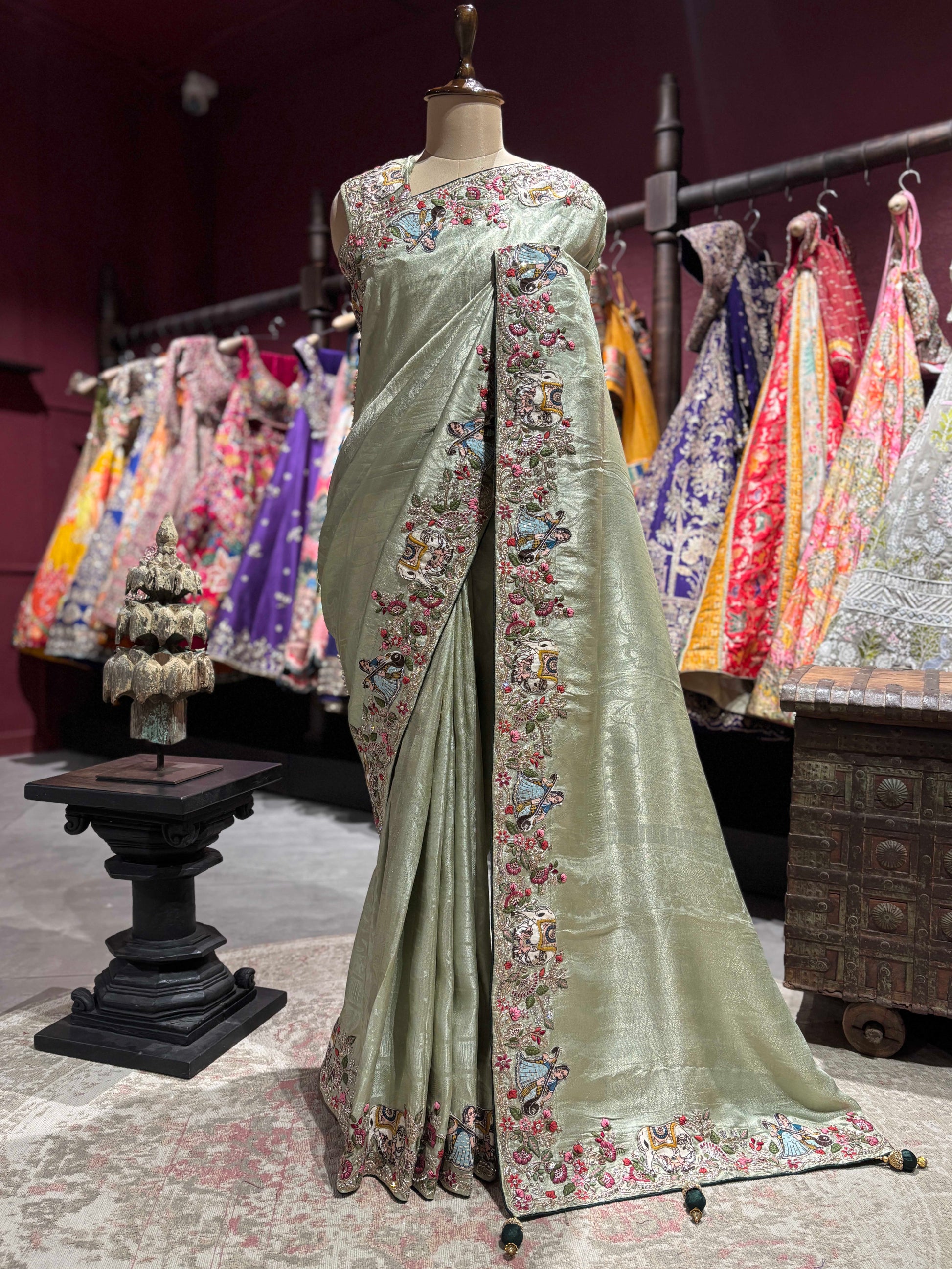 Set on a soft sage green base with a subtle sheen, the intricate embroidery showcases detailed figures, floral accents, and fine threadwork that add depth and character to the saree. The elegant craftsmanship makes this piece truly distinctive and conversation-worthy.