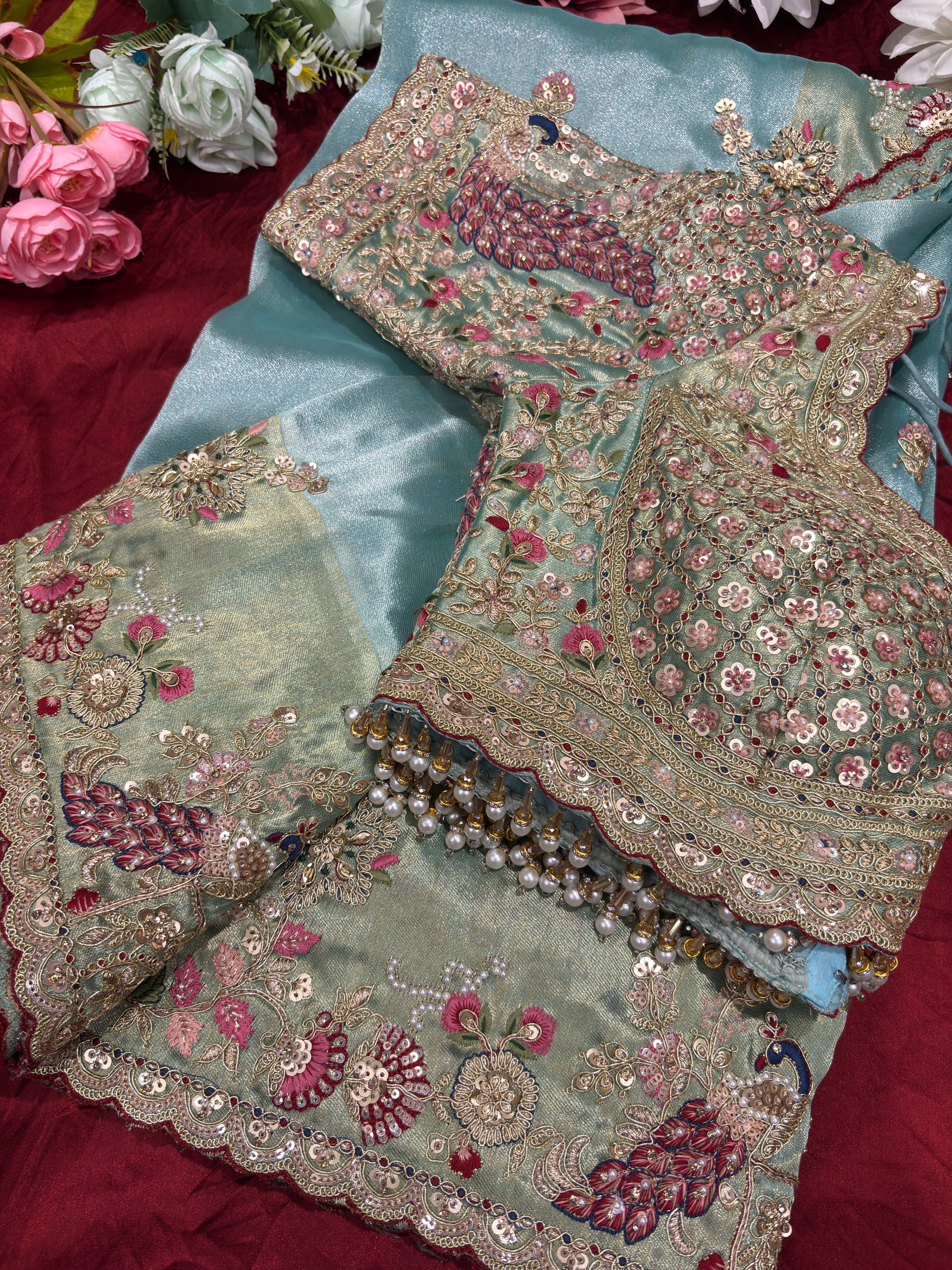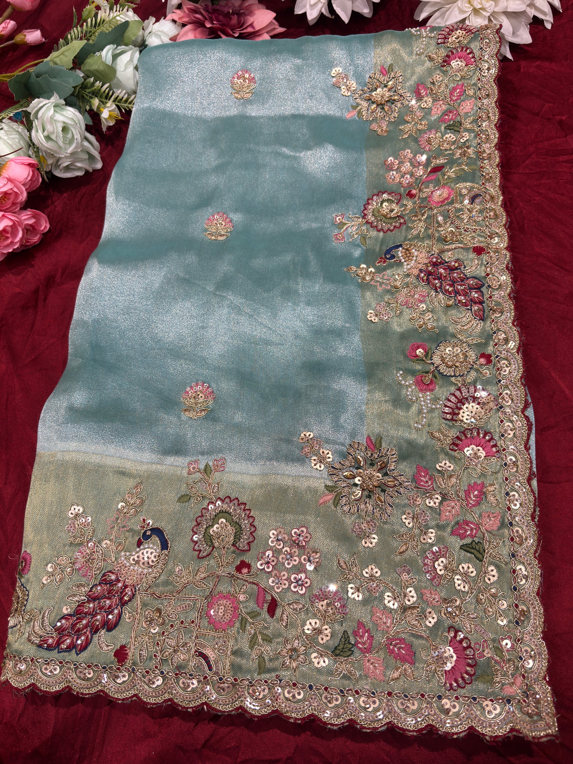 Elevate your ethnic style with this elegant sea Blue silk saree featuring intricate peacock and floral embroidery. The saree is beautifully enhanced with delicate threadwork, sequins, and fine embellishments that create a graceful and luxurious look. The richly embroidered border adds a royal touch to the ensemble. Paired with a heavily embellished designer blouse adorned with detailed hand embroidery, beadwork, and pearl tassels, this saree is perfect for weddings, receptions, and festive occasions. A perfect blend of tradition and modern elegance.