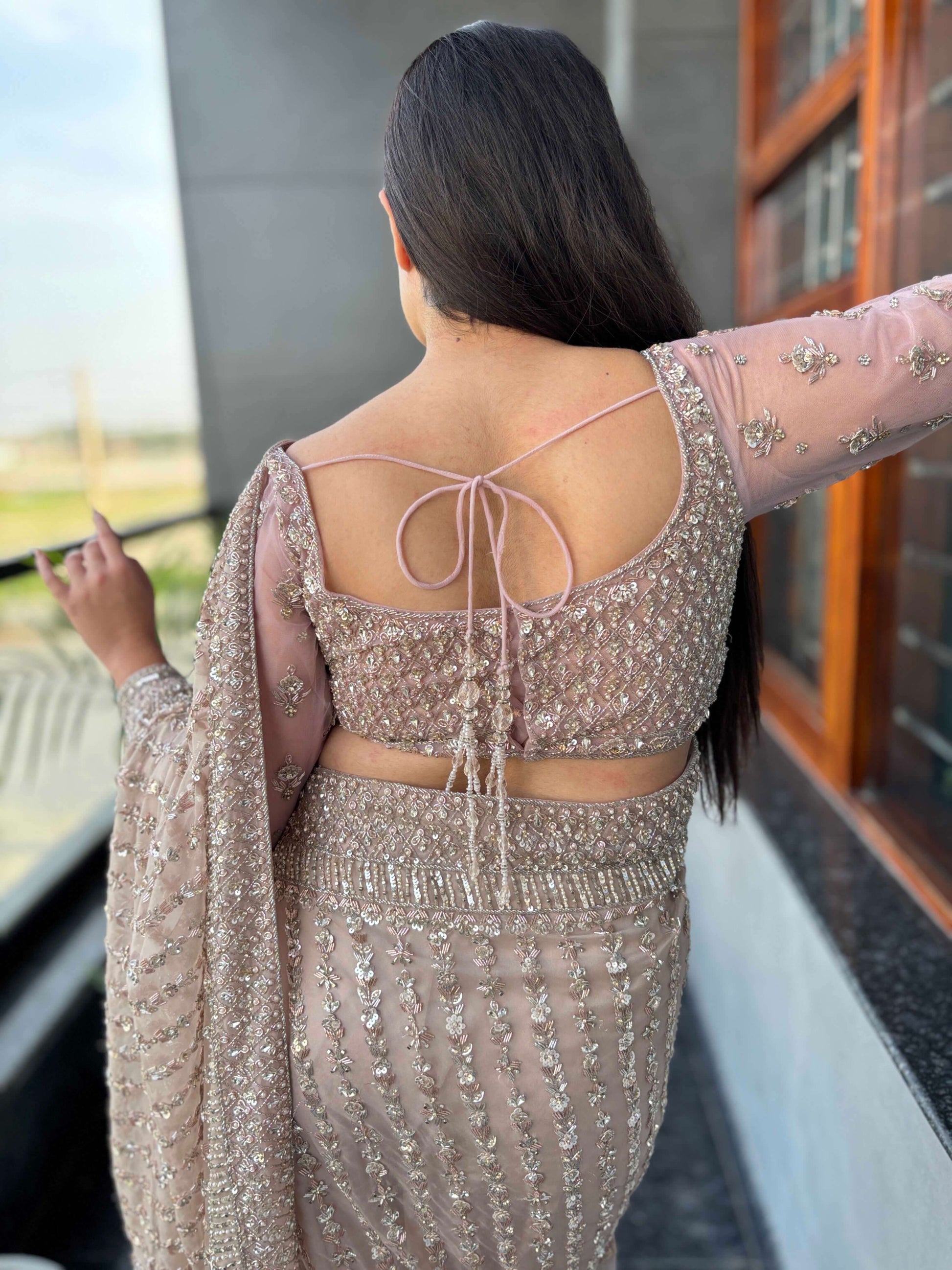 The saree is richly adorned with all-over sequin and thread embroidery in delicate patterns that catch the light with every movement. The intricately embellished border and pallu add a luxurious finish, making it a true statement piece. It comes paired with a heavily embroidered designer blouse that elevates the overall look with refined sparkle and sophistication.