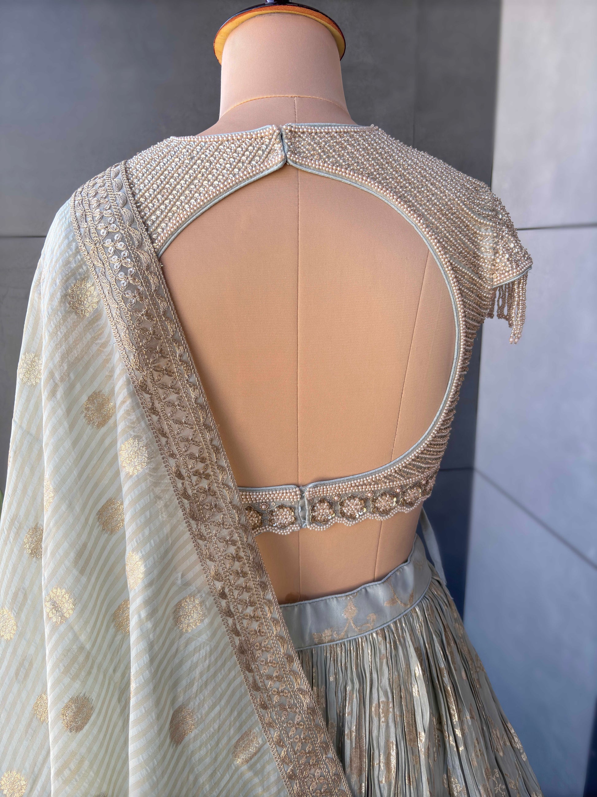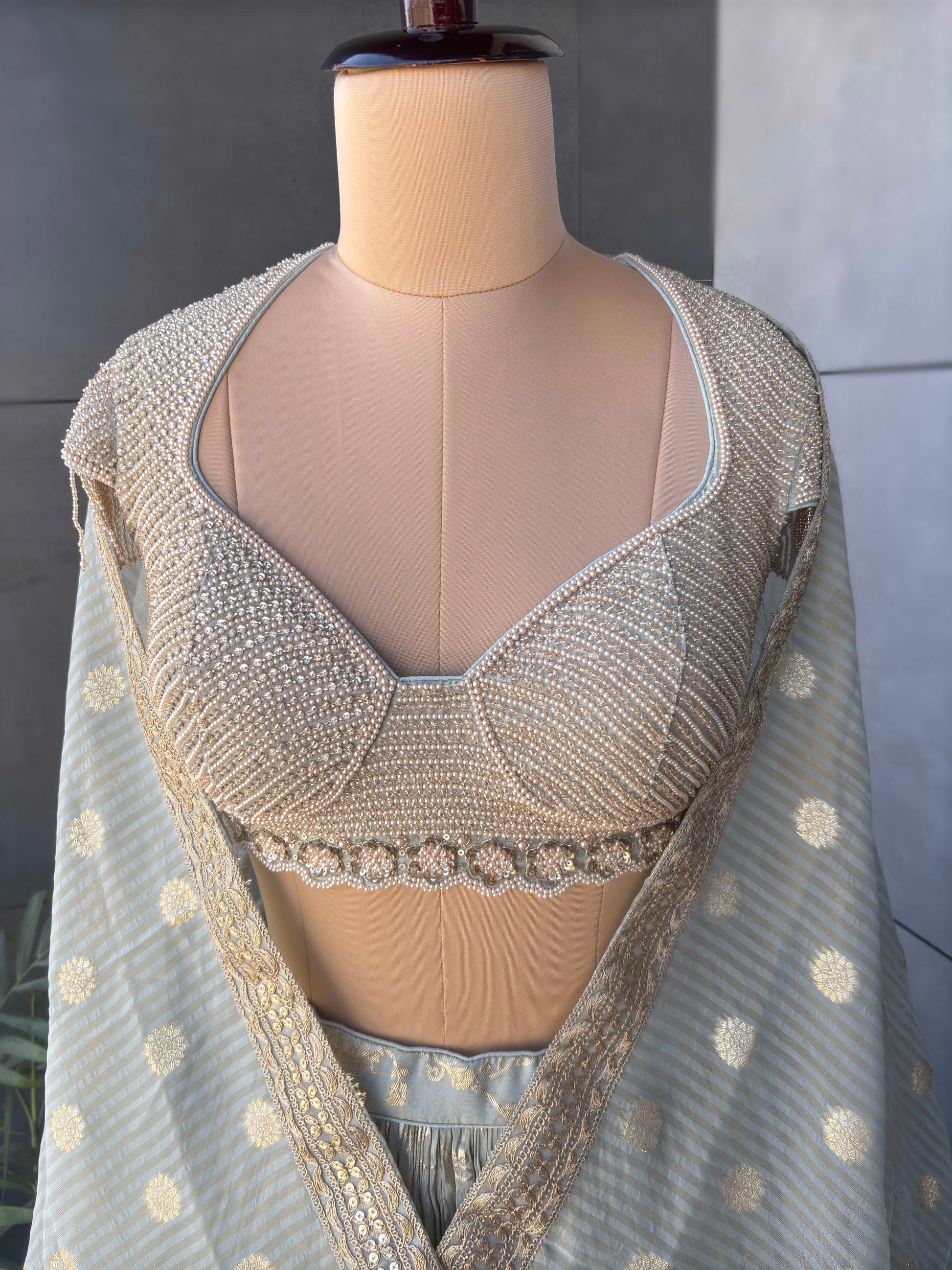 This lehenga set showcases the perfect balance of tradition and elegance. The blouse is adorned with intricate embroidery and detailed embellishments, complementing the voluminous flared skirt that features ornate patterns and meticulous craftsmanship. Paired with a sheer dupatta embellished with delicate designs, this ensemble is ideal for weddings, cultural festivities, and grand celebrations. It embodies timeless charm and sophisticated artistry