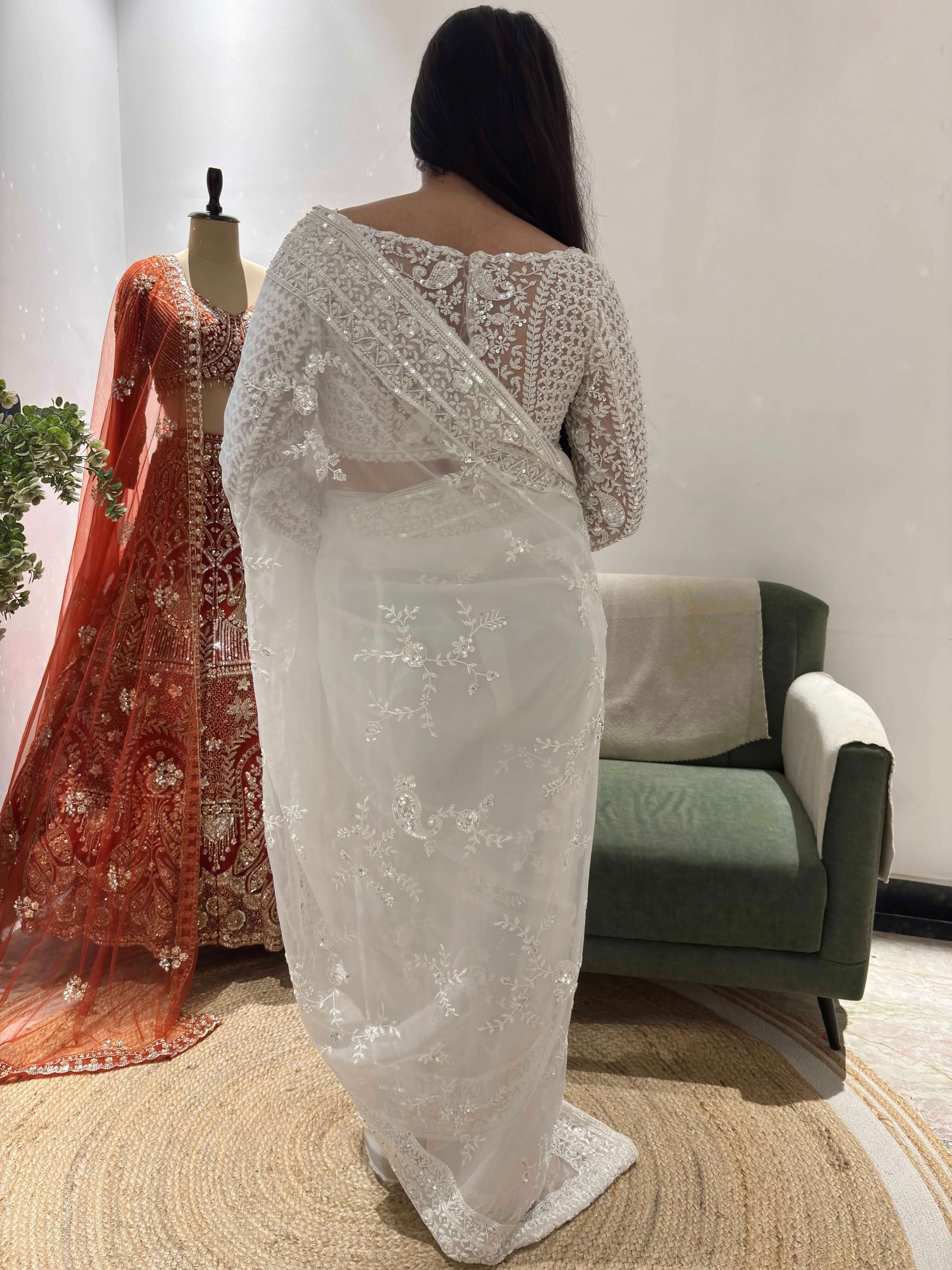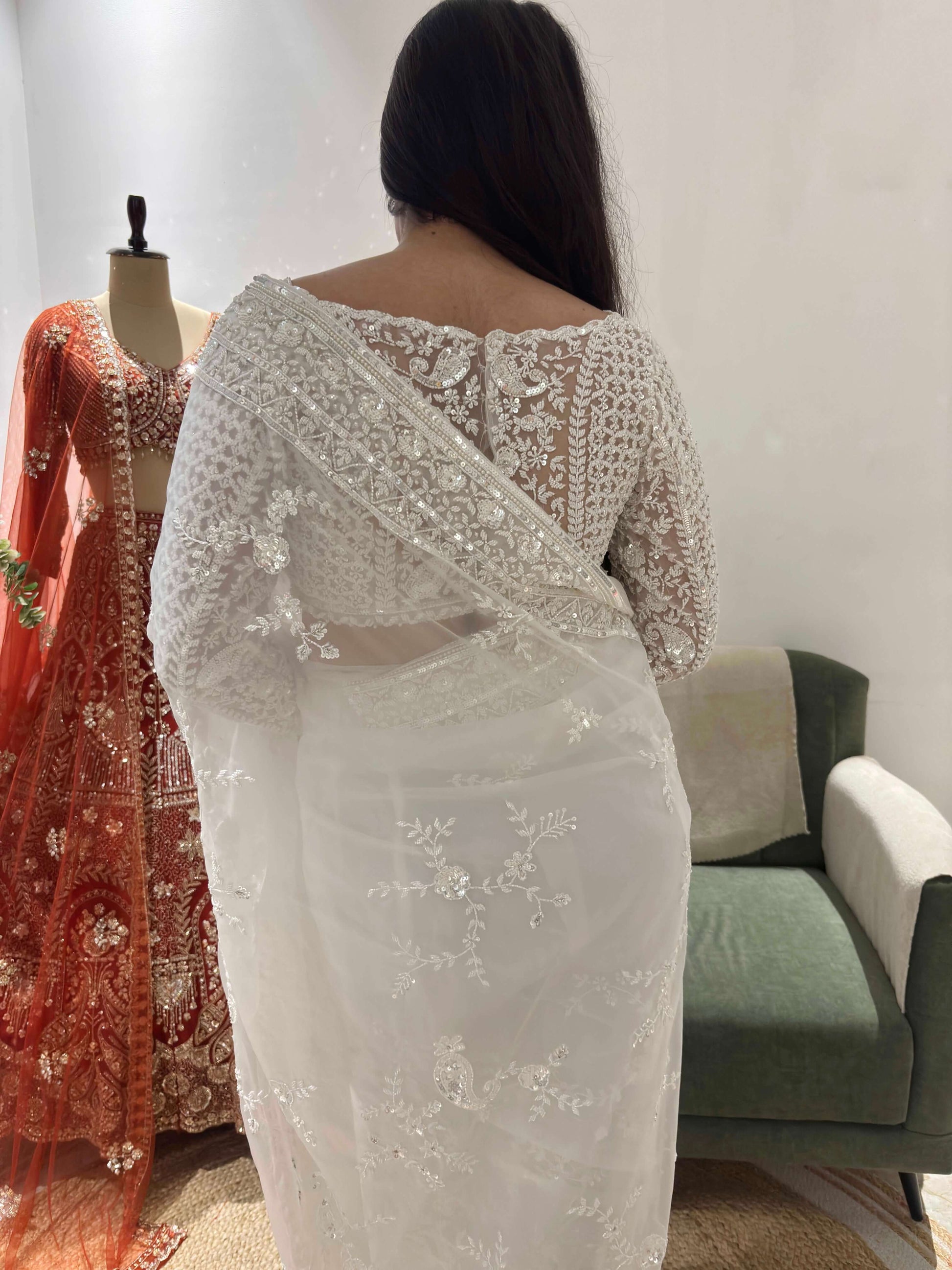Exude timeless grace in this breathtaking white organza saree, designed for women who love soft sophistication with a touch of luxury. The lightweight, sheer organza fabric creates a dreamy, flowy drape that looks effortlessly elegant.